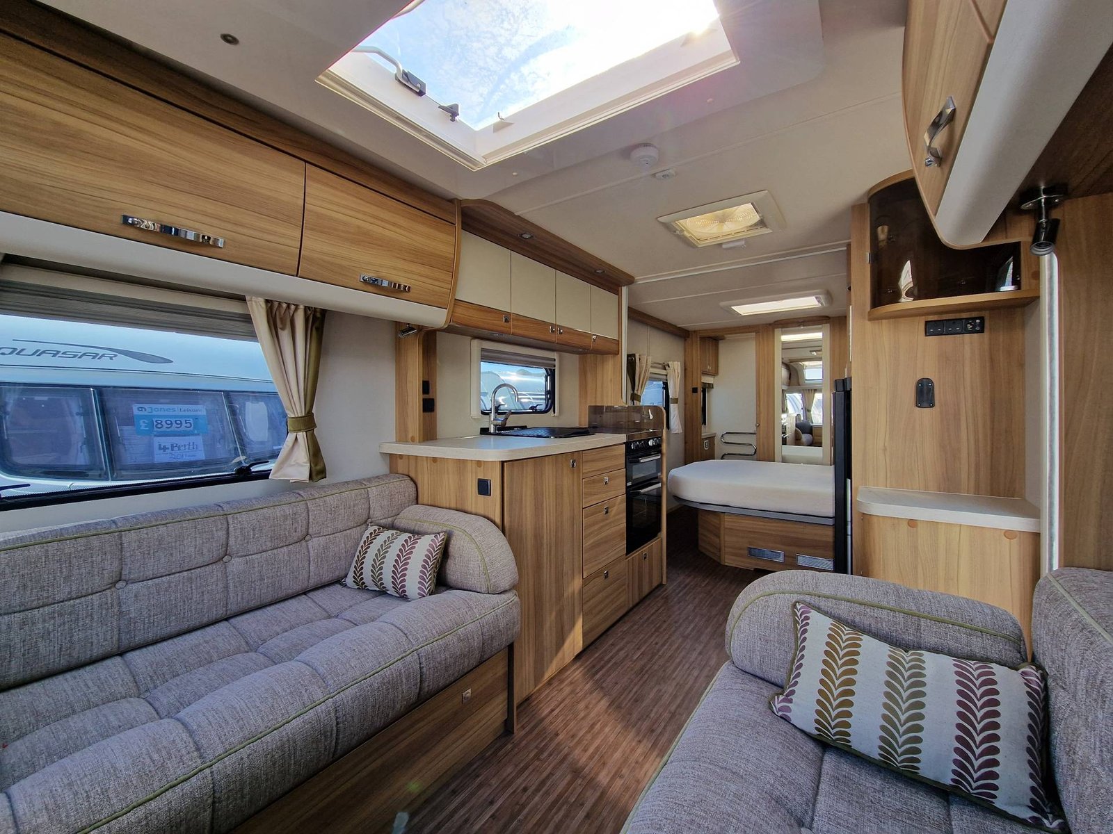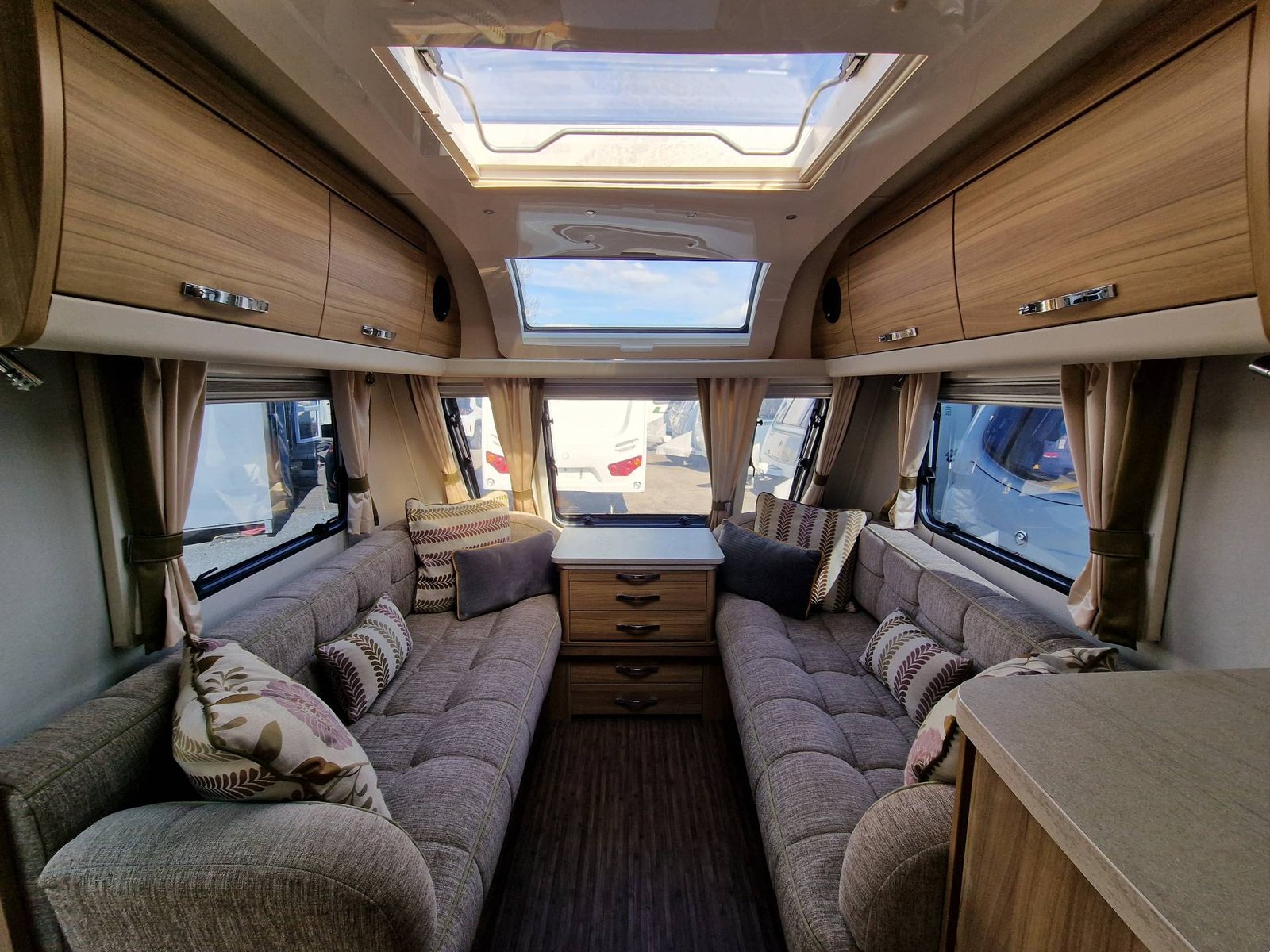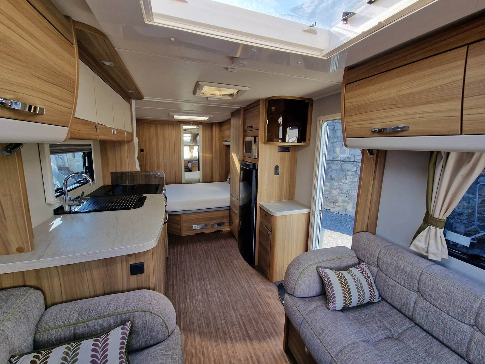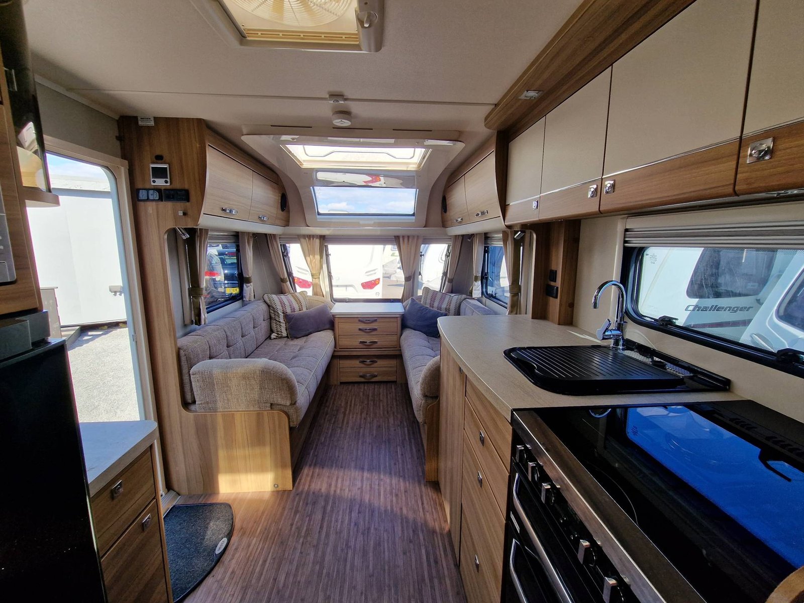 This Elddis Crusader Storm 2015 has a Lounge / Dining Area, Kitchen, Bedroom and a Bathroom. The Lounge is at the front of the caravan, it has Two Long Seats that can be used as Two Single Beds or be converted into a Double Bed. There is also a Free Standing Table which turns the lounge into a Dining Area. The Kitchen is situated in the middle of the caravan and includes all the essentials, it has an Oven, Grill, Hob, Sink, Fridge / Freezer and a Microwave. Next to the Fridge is a place for a T.V. The Bedroom is towards the end of the caravan, it has a Transverse Island Bed and Two Wardrobes either side of the bed. The Bedroom is at the end of the caravan and includes a Cassette Toilet, Sink / Vanity Unit and a Shower. Throughout the Elddis Crusader Storm is plenty of Storage Space.