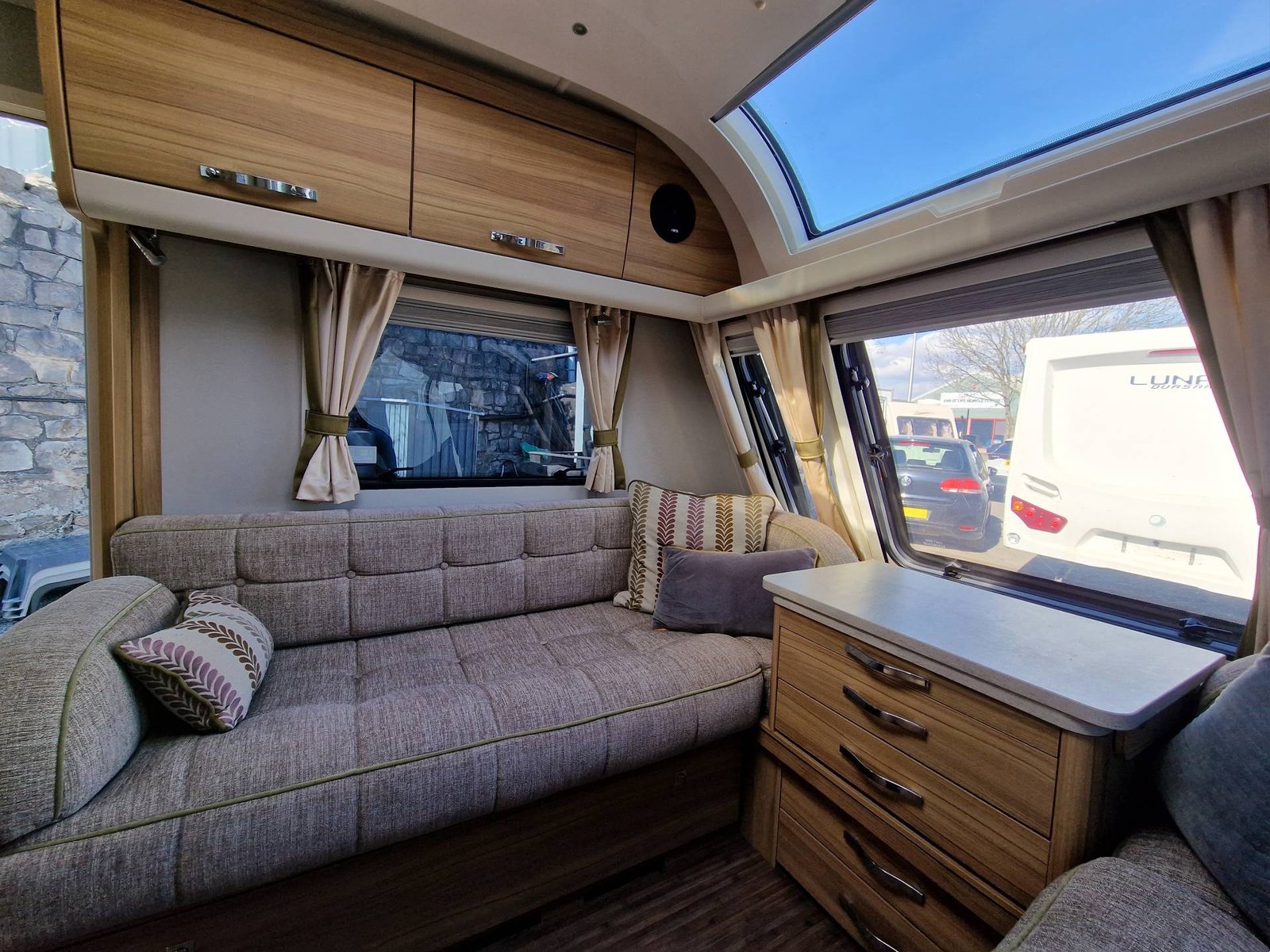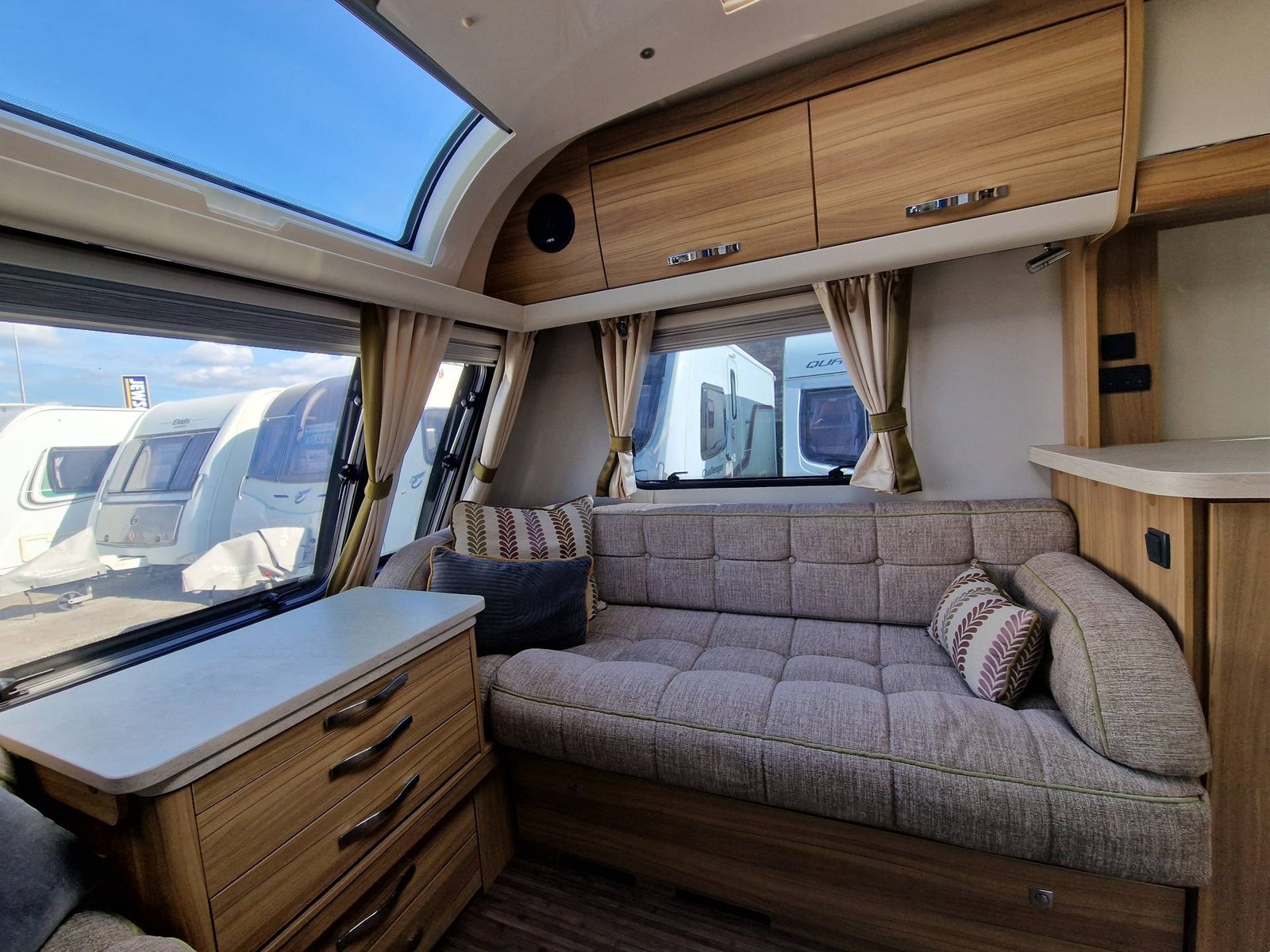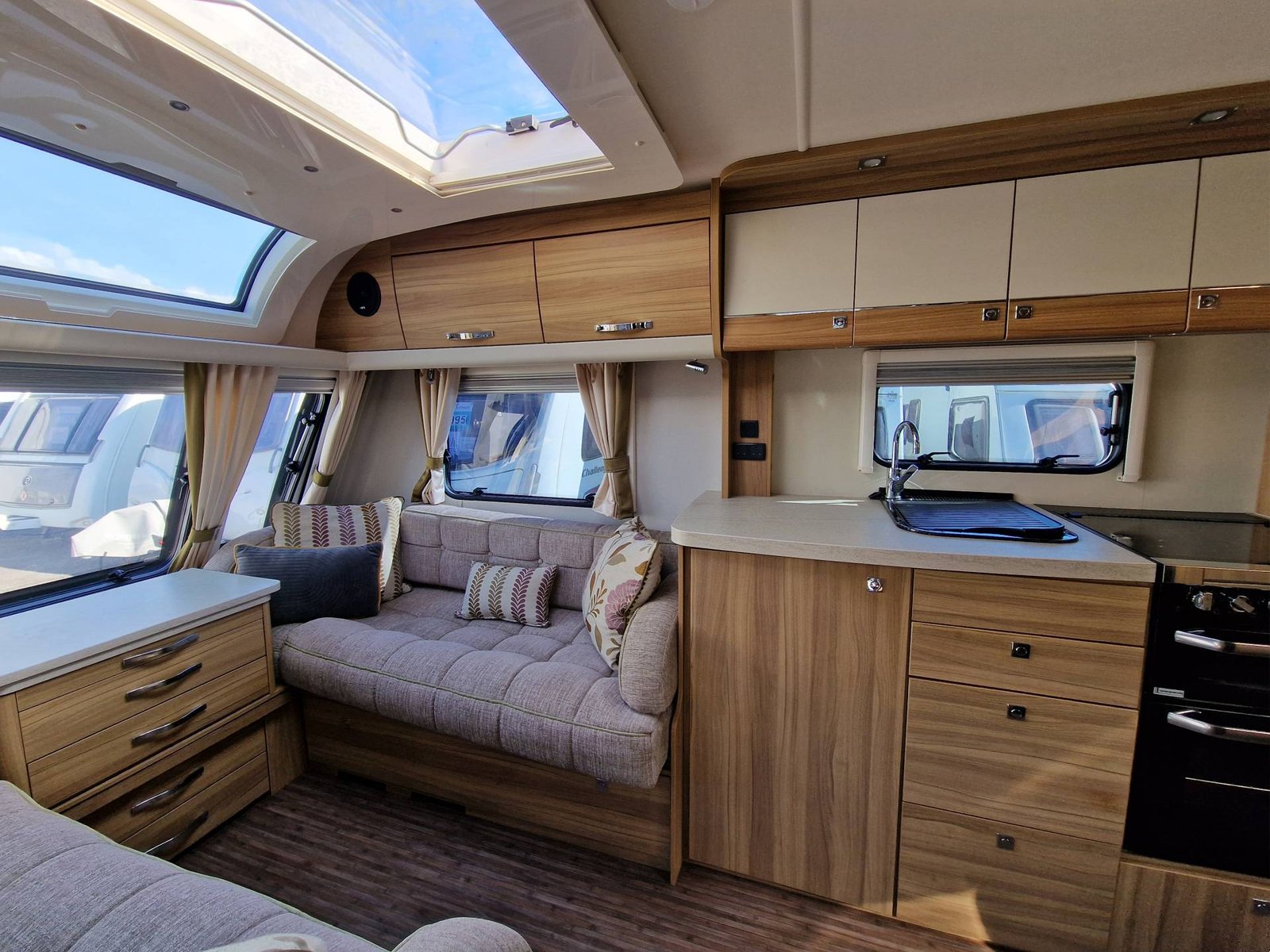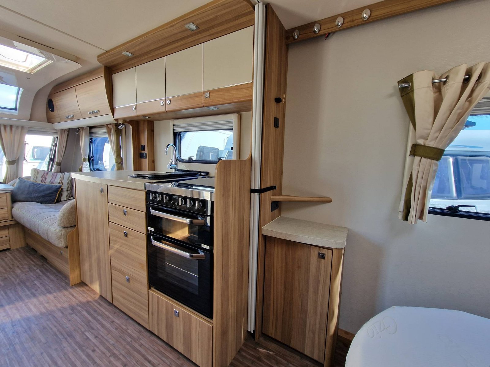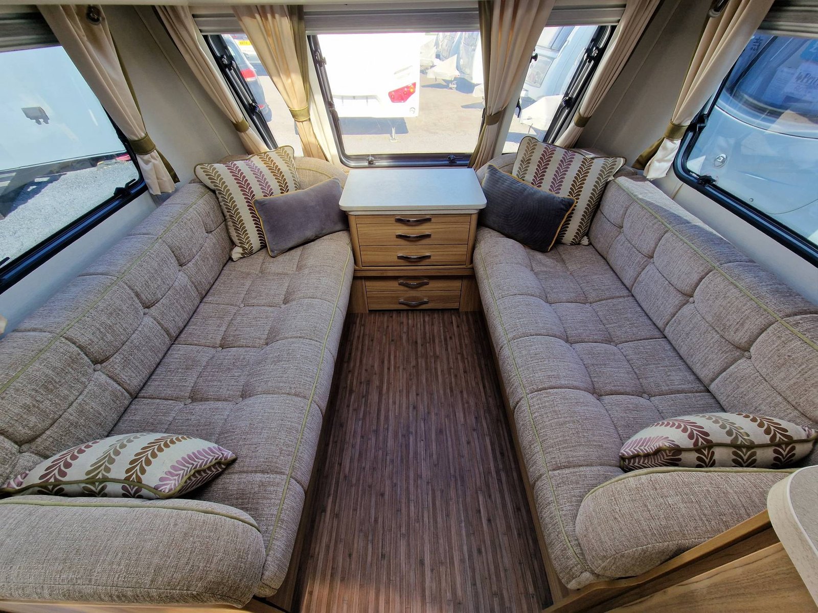 This Elddis Crusader Storm 2015 has a Lounge / Dining Area, Kitchen, Bedroom and a Bathroom. The Lounge is at the front of the caravan, it has Two Long Seats that can be used as Two Single Beds or be converted into a Double Bed. There is also a Free Standing Table which turns the lounge into a Dining Area. The Kitchen is situated in the middle of the caravan and includes all the essentials, it has an Oven, Grill, Hob, Sink, Fridge / Freezer and a Microwave. Next to the Fridge is a place for a T.V. The Bedroom is towards the end of the caravan, it has a Transverse Island Bed and Two Wardrobes either side of the bed. The Bedroom is at the end of the caravan and includes a Cassette Toilet, Sink / Vanity Unit and a Shower. Throughout the Elddis Crusader Storm is plenty of Storage Space.