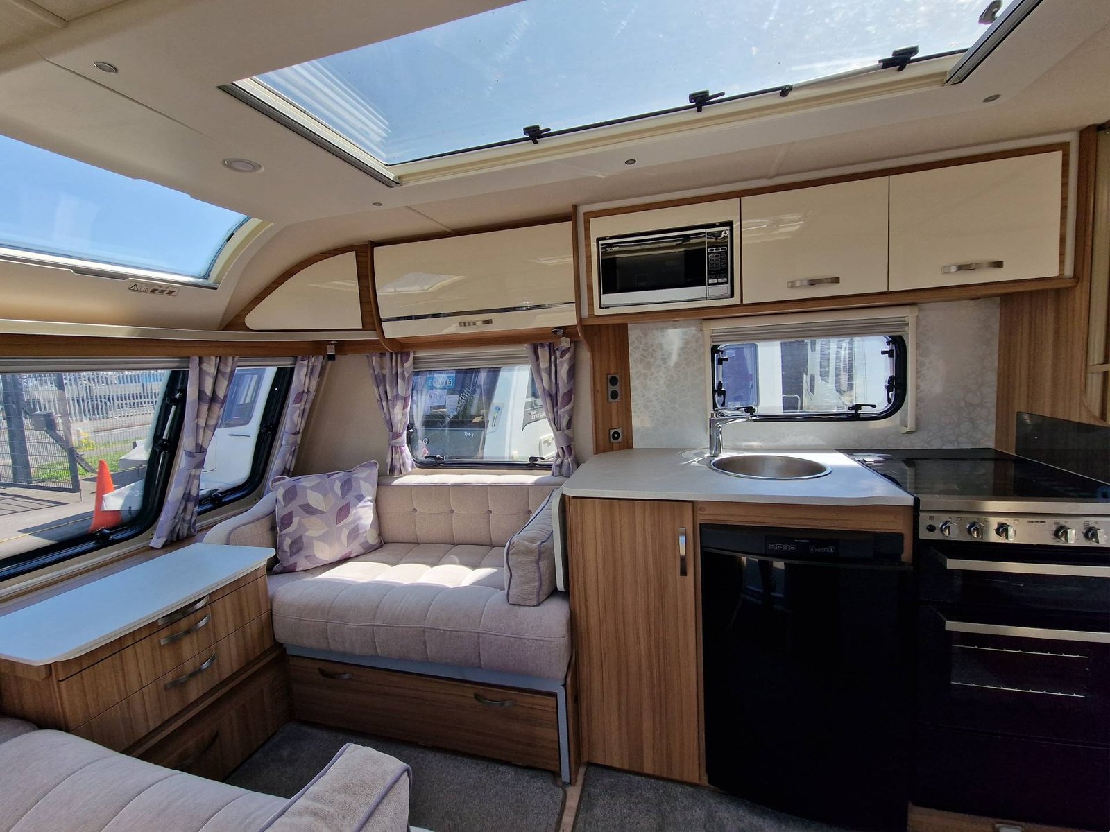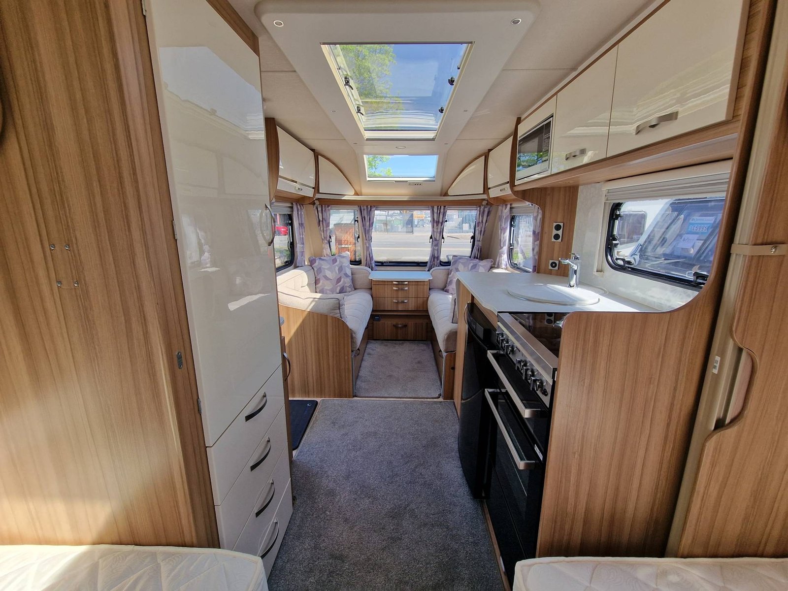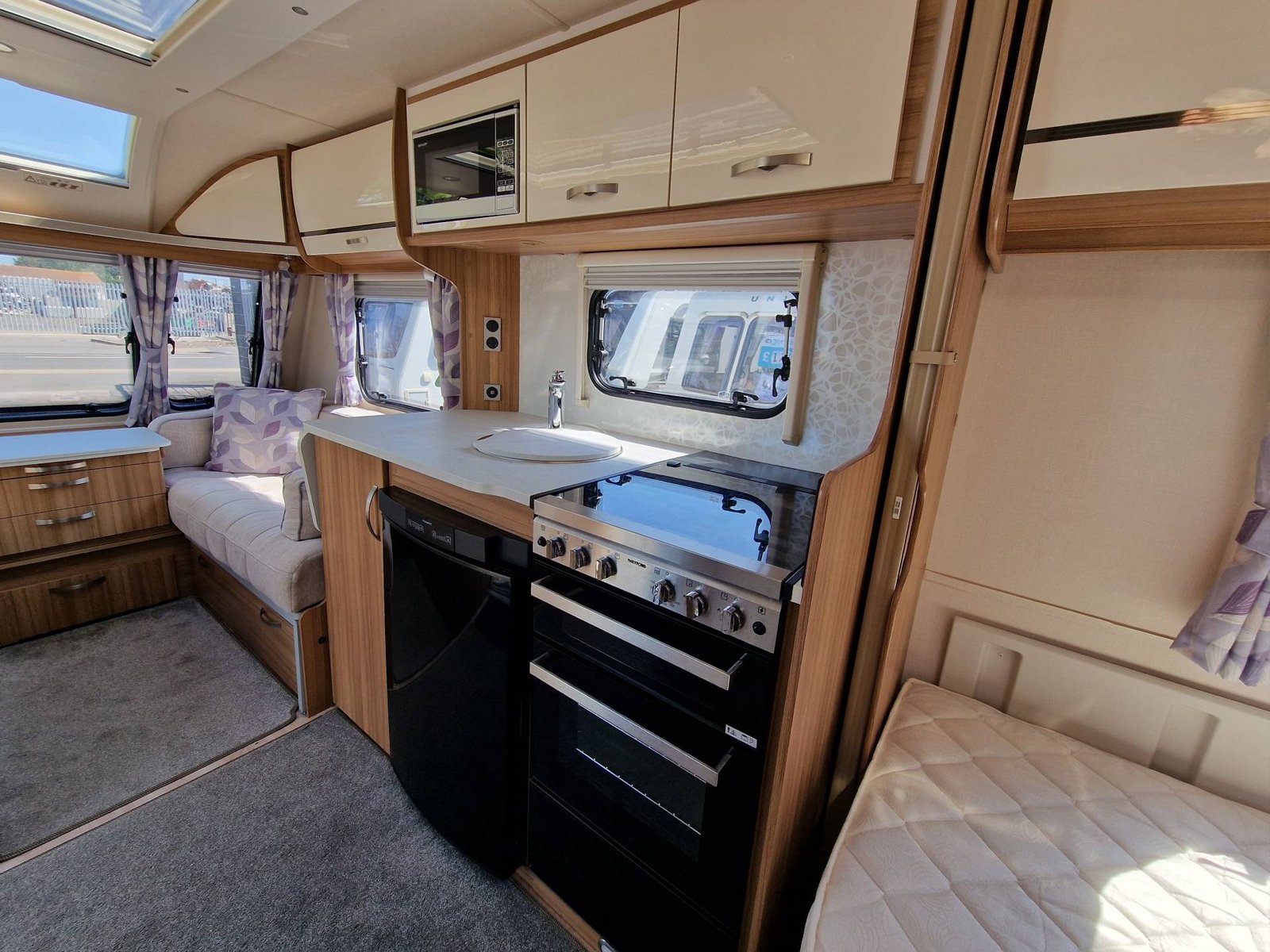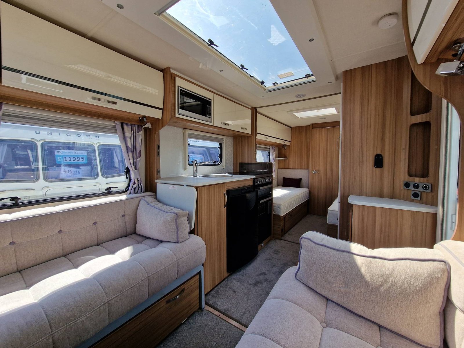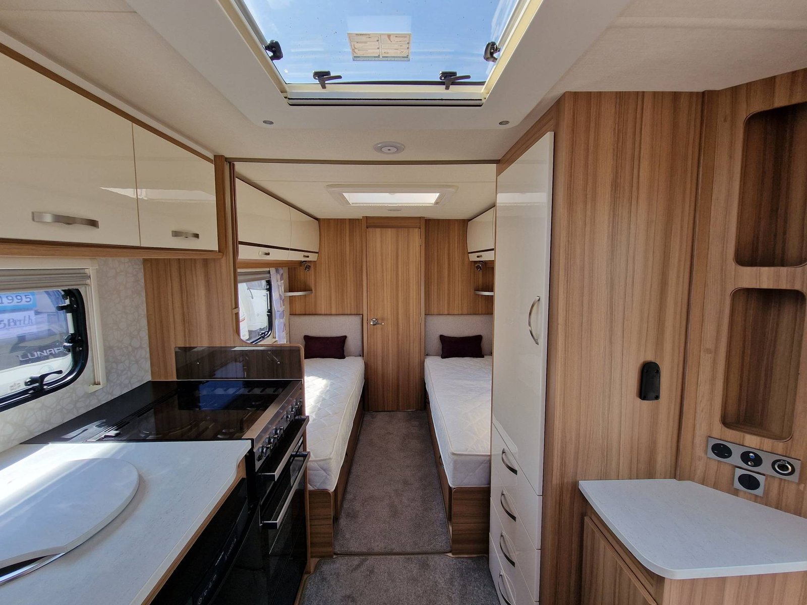 This Lunar Clubman SB 2019 has a Lounge / Dining Area, Kitchen, Bedroom and an End Bathroom. The Lounge is at the front of the caravan and it has Two Seats that can be used as Two Single Beds or be converted into a Double Bed. There is also a Free Standing Table which turns the front lounge into a Dining Area. The Kitchen is situated in the middle of the caravan and includes all the essentials. It has an Oven, Grill, Hob, Sink, Fridge / Freezer and a Microwave. The Bedroom is towards the back of the caravan and it includes Two Fixed Single Beds and a Wardrobe. The Bathroom is at the end of the caravan and it has a Cassette Toilet, Shower and a Sink / Vanity Unit all Separate. Throughout the Lunar Clubmand SB Is Plenty of Storage Space.