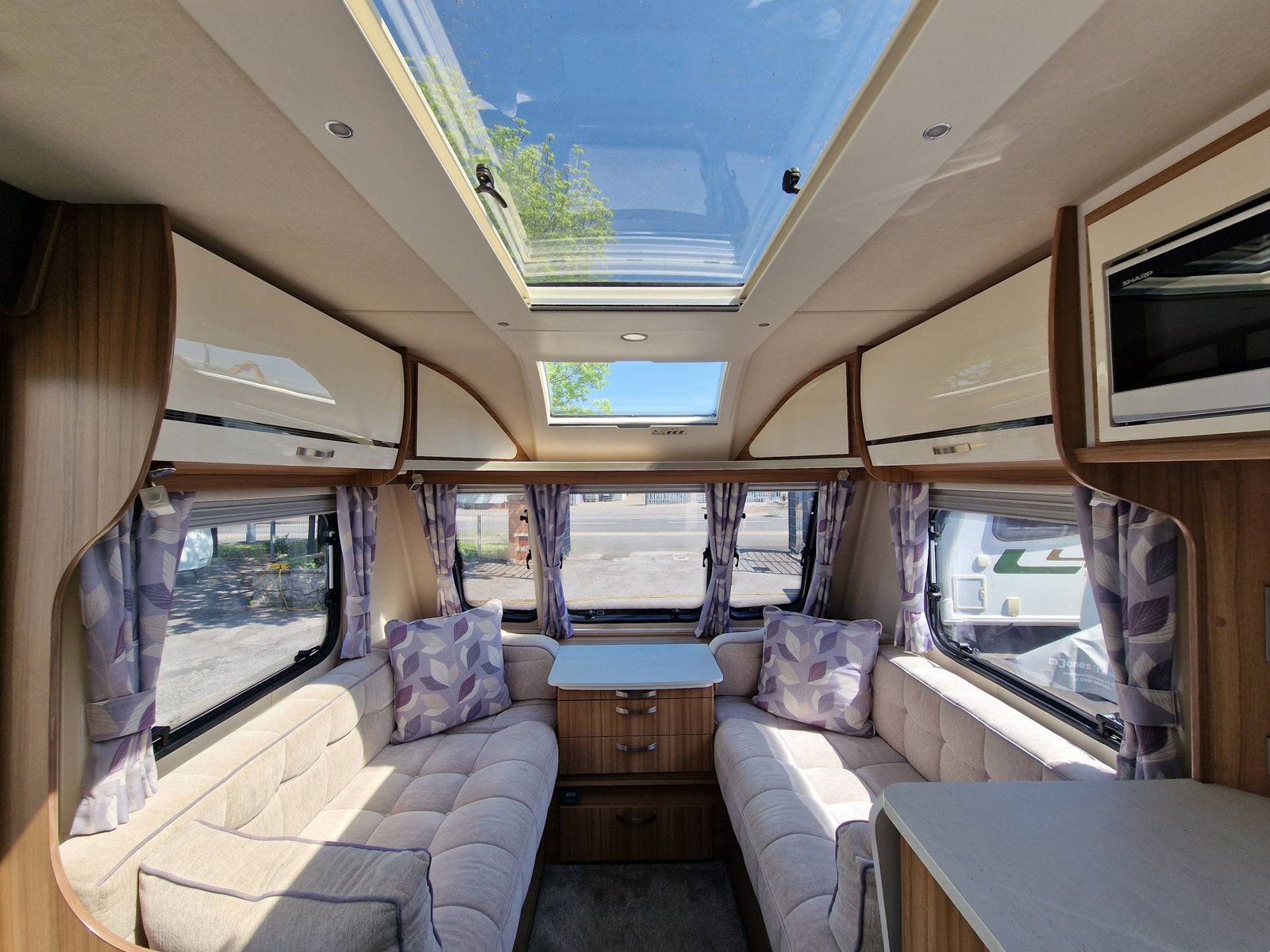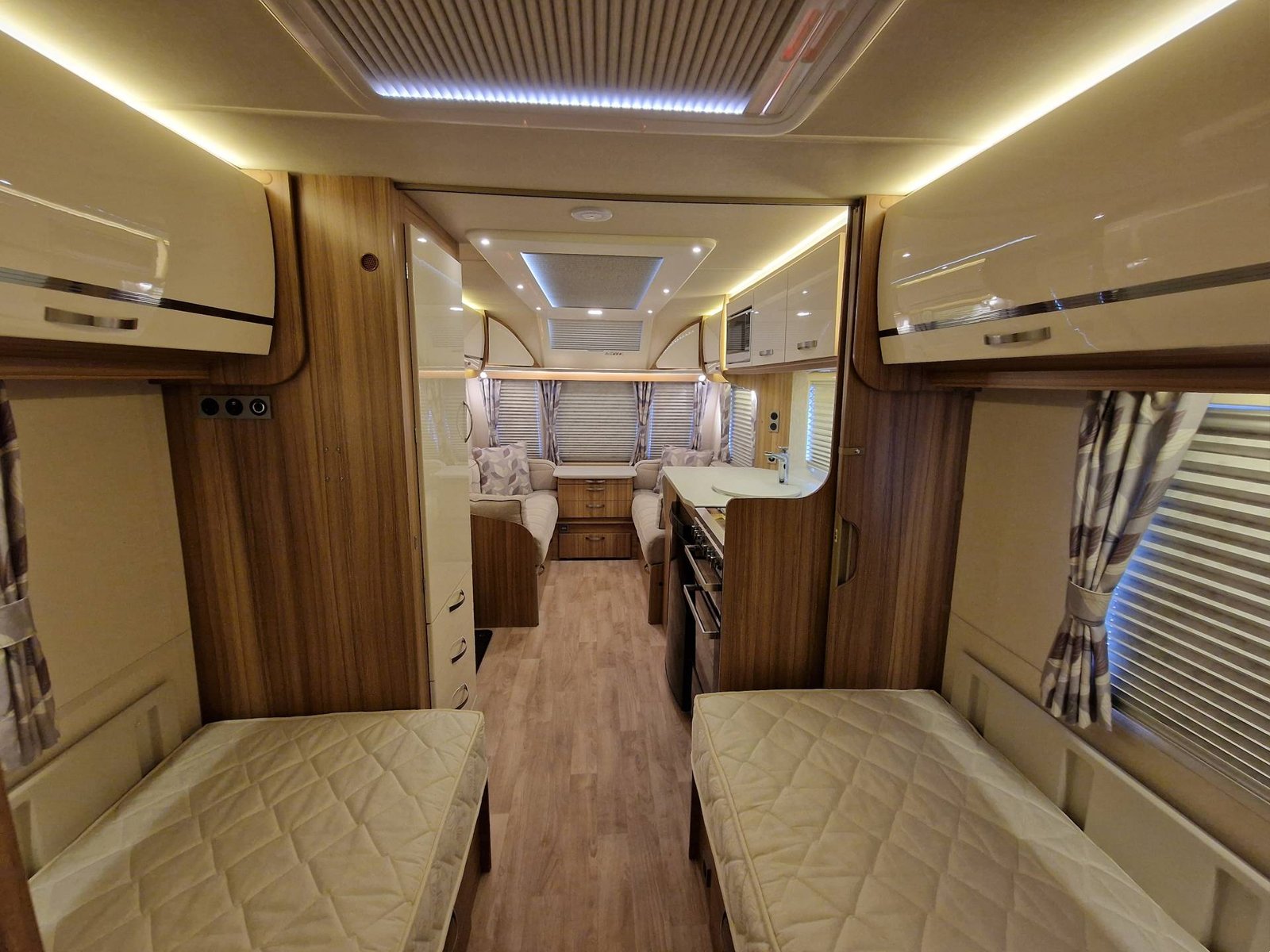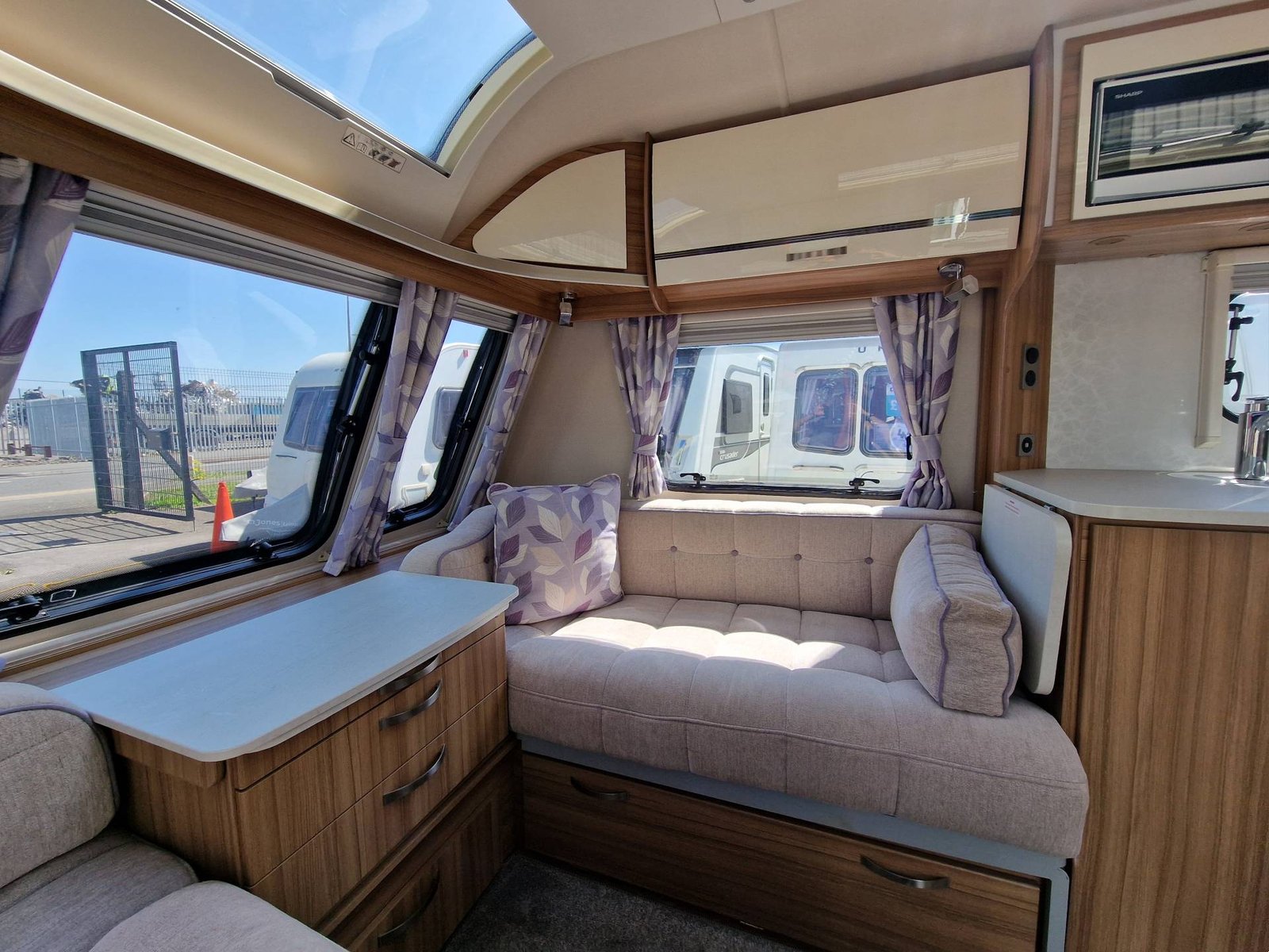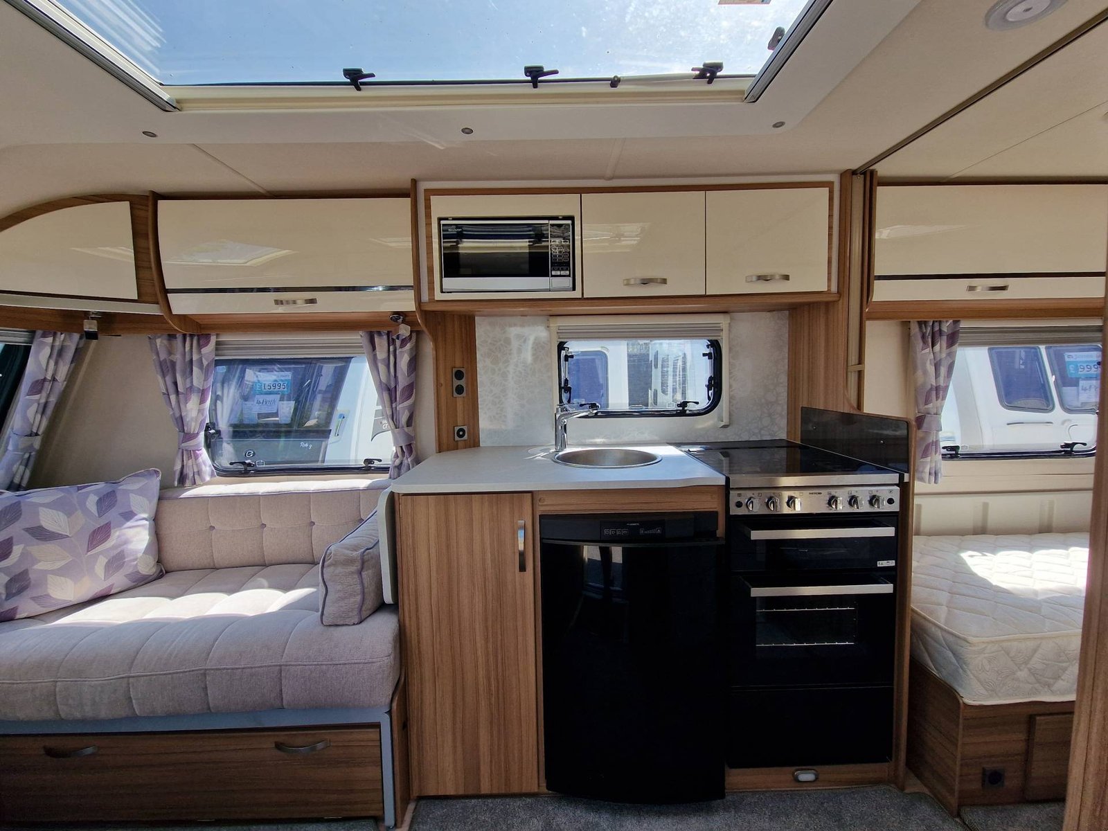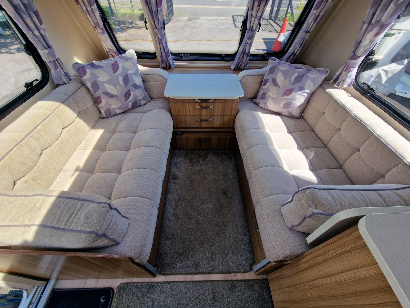 This Lunar Clubman SB 2019 has a Lounge / Dining Area, Kitchen, Bedroom and an End Bathroom. The Lounge is at the front of the caravan and it has Two Seats that can be used as Two Single Beds or be converted into a Double Bed. There is also a Free Standing Table which turns the front lounge into a Dining Area. The Kitchen is situated in the middle of the caravan and includes all the essentials. It has an Oven, Grill, Hob, Sink, Fridge / Freezer and a Microwave. The Bedroom is towards the back of the caravan and it includes Two Fixed Single Beds and a Wardrobe. The Bathroom is at the end of the caravan and it has a Cassette Toilet, Shower and a Sink / Vanity Unit all Separate. Throughout the Lunar Clubmand SB Is Plenty of Storage Space.