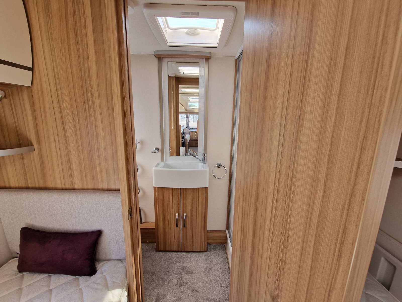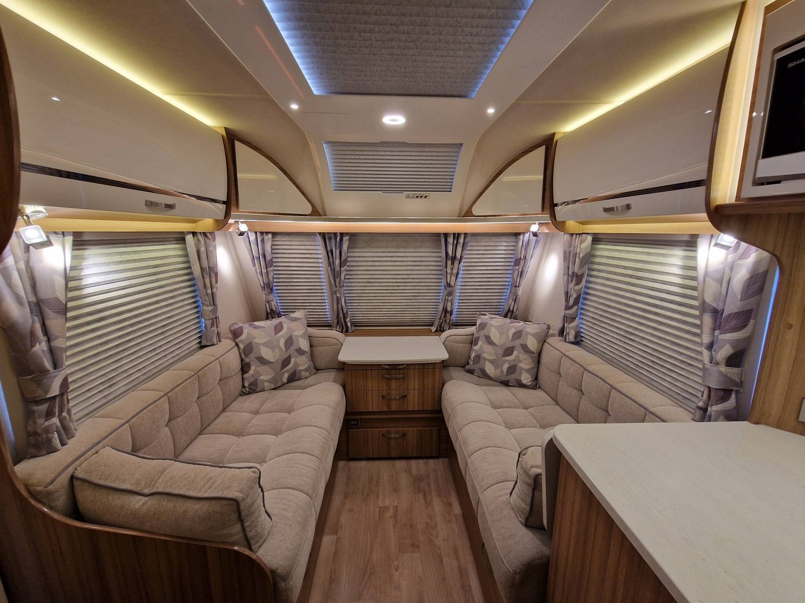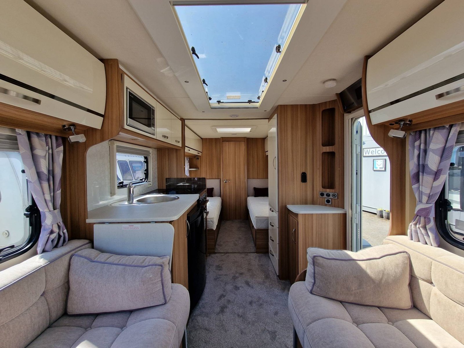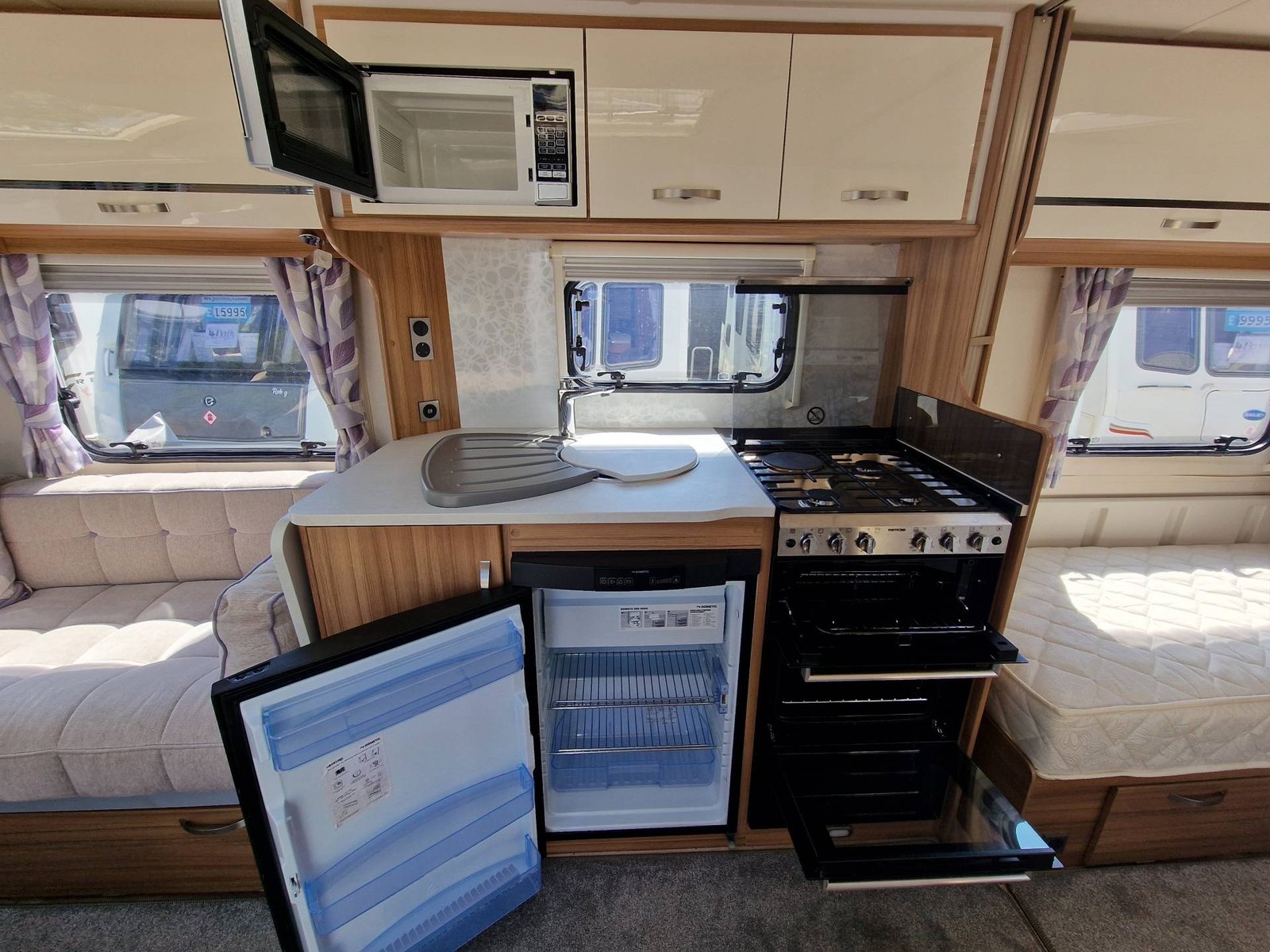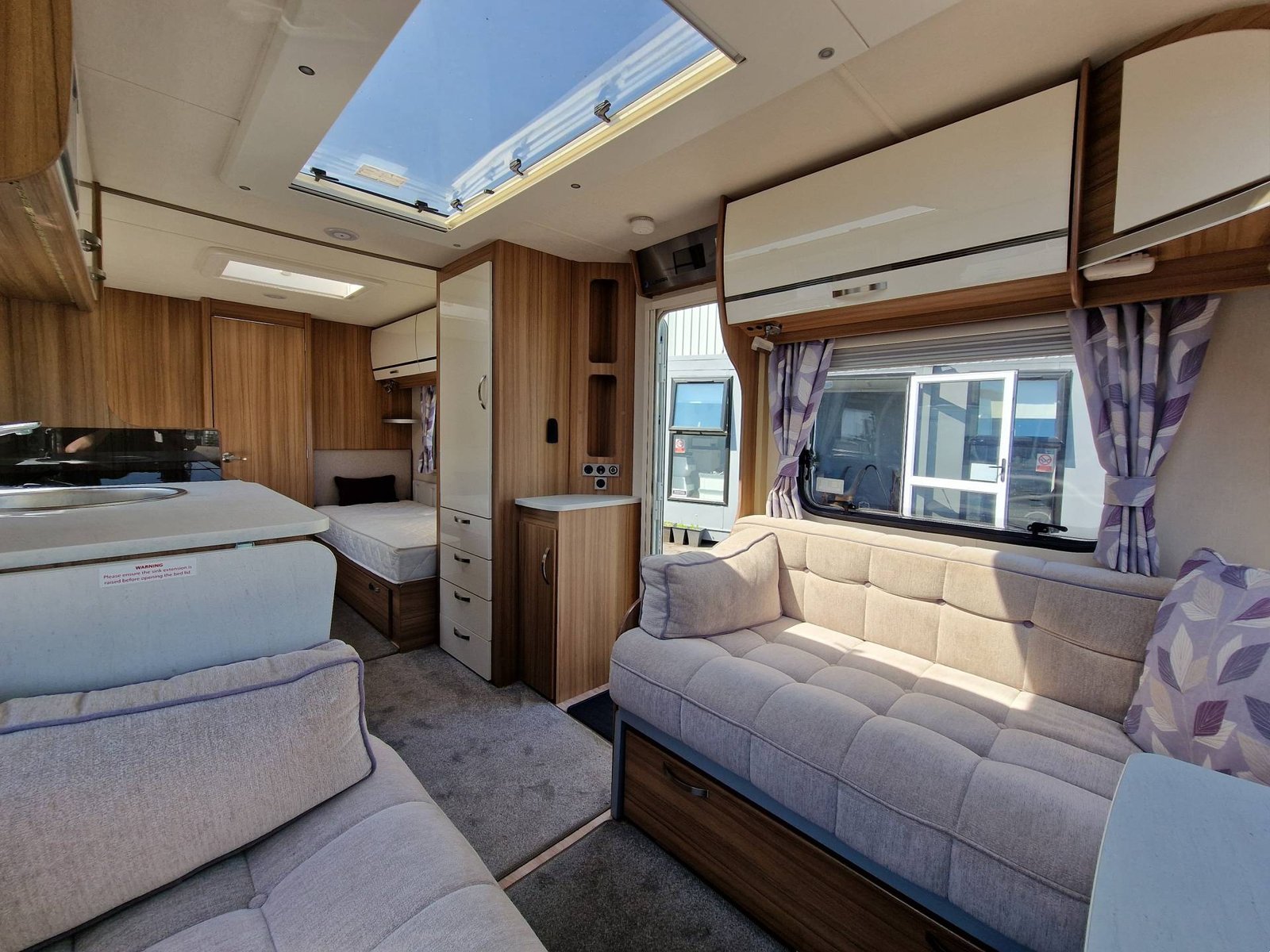 This Lunar Clubman SB 2019 has a Lounge / Dining Area, Kitchen, Bedroom and an End Bathroom. The Lounge is at the front of the caravan and it has Two Seats that can be used as Two Single Beds or be converted into a Double Bed. There is also a Free Standing Table which turns the front lounge into a Dining Area. The Kitchen is situated in the middle of the caravan and includes all the essentials. It has an Oven, Grill, Hob, Sink, Fridge / Freezer and a Microwave. The Bedroom is towards the back of the caravan and it includes Two Fixed Single Beds and a Wardrobe. The Bathroom is at the end of the caravan and it has a Cassette Toilet, Shower and a Sink / Vanity Unit all Separate. Throughout the Lunar Clubmand SB Is Plenty of Storage Space.