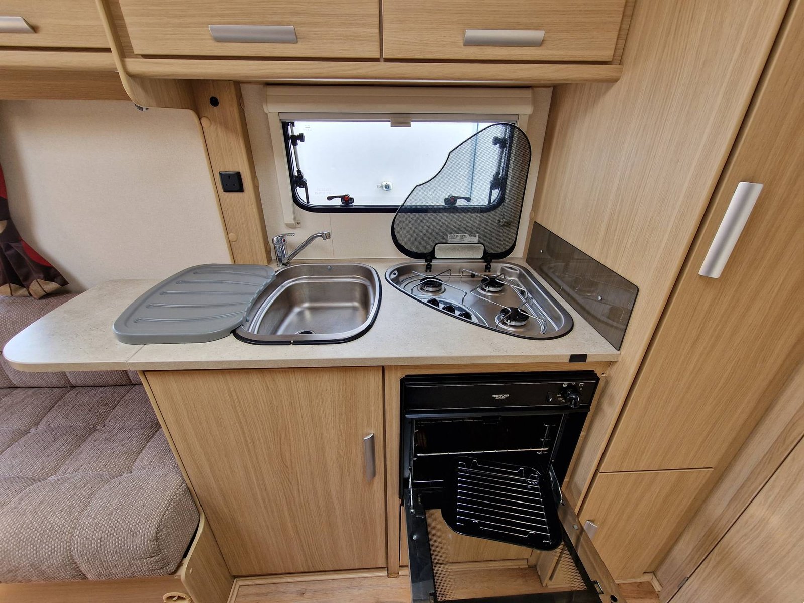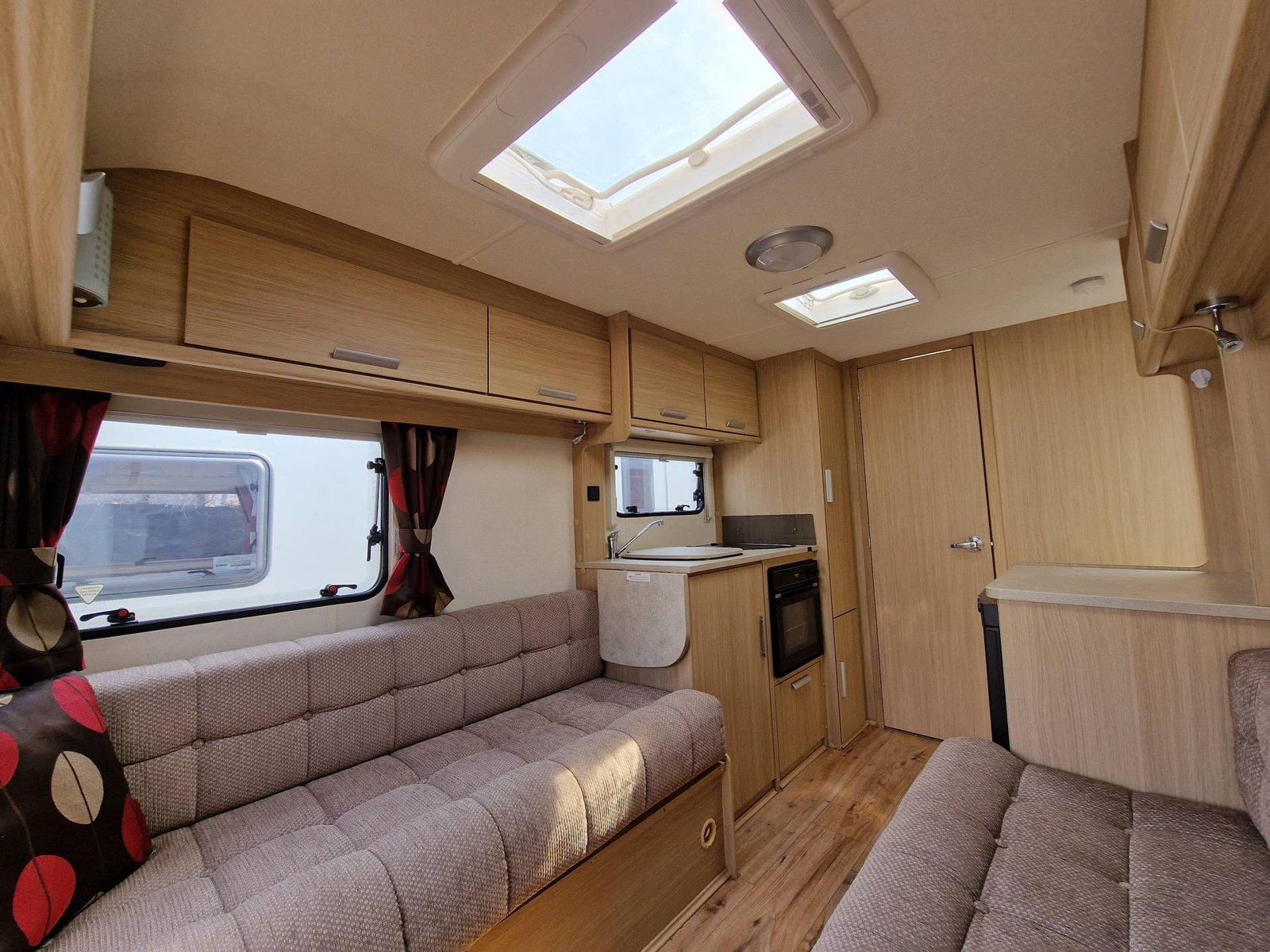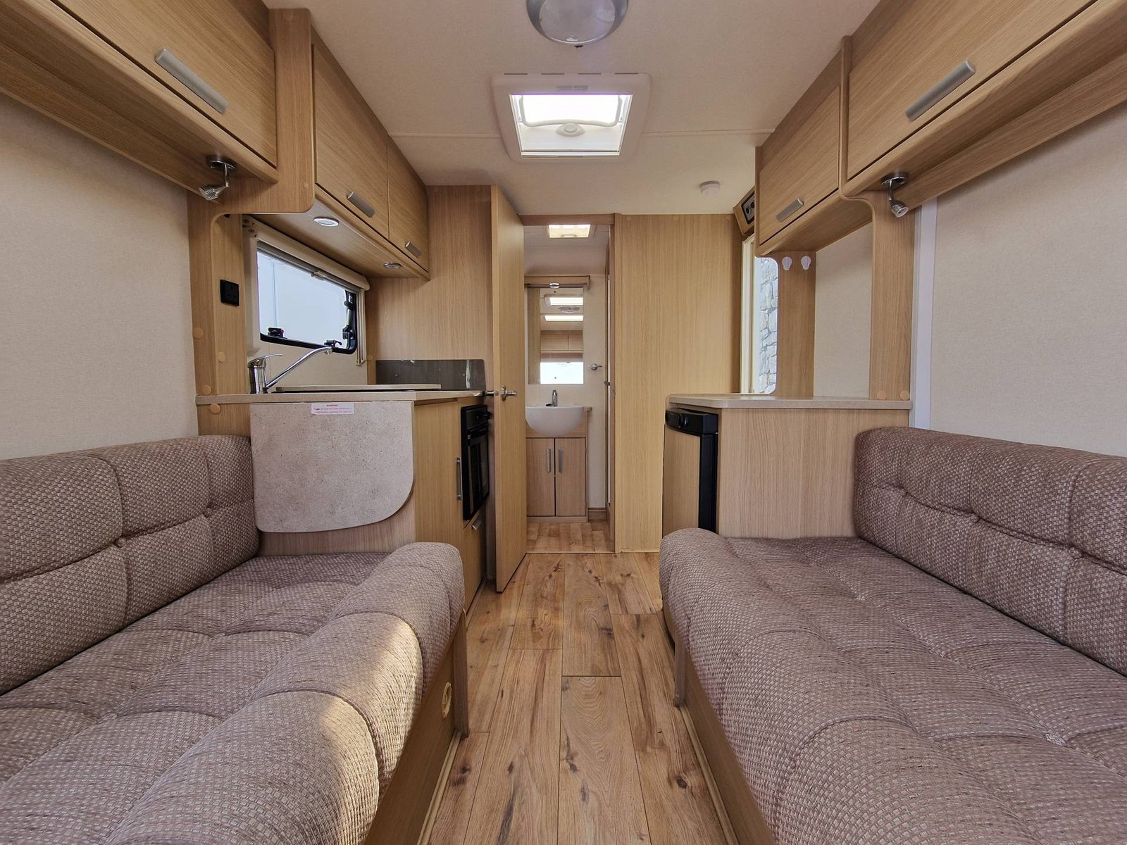 This Lunar Venus 380/2 2014 has a Lounge / Dining Area, Kitchen and a Bathroom. The Lounge is at the front of the caravan it has Two Seats that can be used as Two Single Beds or be converted into a Double Bed. There is also a Free Standing Table which turns the lounge into a Dining Area. The Kitchen is in the middle of the caravan and it includes all the essentials. It has an Oven / Grill, Hob, Sink, Fridge / Freezer and a Microwave. Opposite the kitchen is a place for a T.V. The Bathroom is at the end of the caravan, it includes a Shower, Sink / Vanity Unit and a Cassette Toilet all Separate. Throughout the Lunar Venus 380/2 2014 is plenty of storage space.